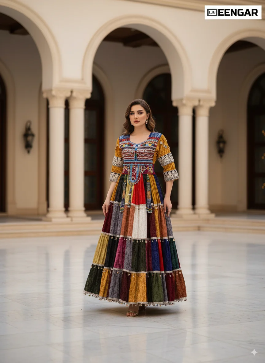 Introducing the “Afghan Opulence Square Embroidered Robe” – a breathtaking synthesis of tradition and luxury. This enchanting Afghan dress is adorned with a mesmerizing display of multicolored square velvet designs, each square telling a story of its own, reminiscent of a rich tapestry of culture.