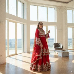 “Ruby and Gold Glamour” is a stunning Afghan dress that elegantly combines deep crimson red with intricate golden embroidery.