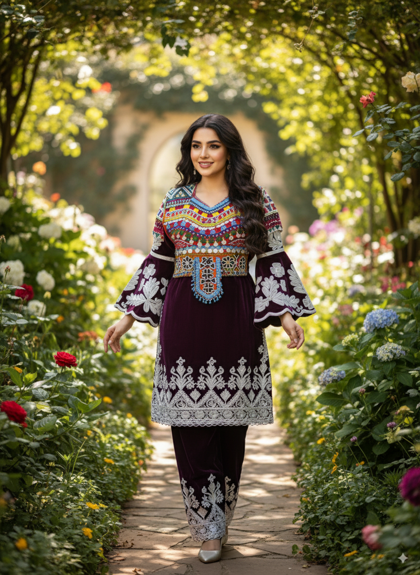 Step into the world of glamour with our ‘Trendy Mocha Velvet Glam.’ This contemporary Afghan dress redefines sophistication with its luxurious brown velvet fabric and modern short shirt design. The intricate white Zardozi work adds a touch of elegance, creating a perfect fusion of tradition and style. The long sleeves enhance the chic look while providing comfort. Embrace the allure of this ensemble, where the rich mocha hue meets the artistry of Zardozi detailing, making every moment a statement of fashion and grace. Elevate your style quotient with this trendy attire, designed for those who appreciate the perfect blend of tradition and modernity.