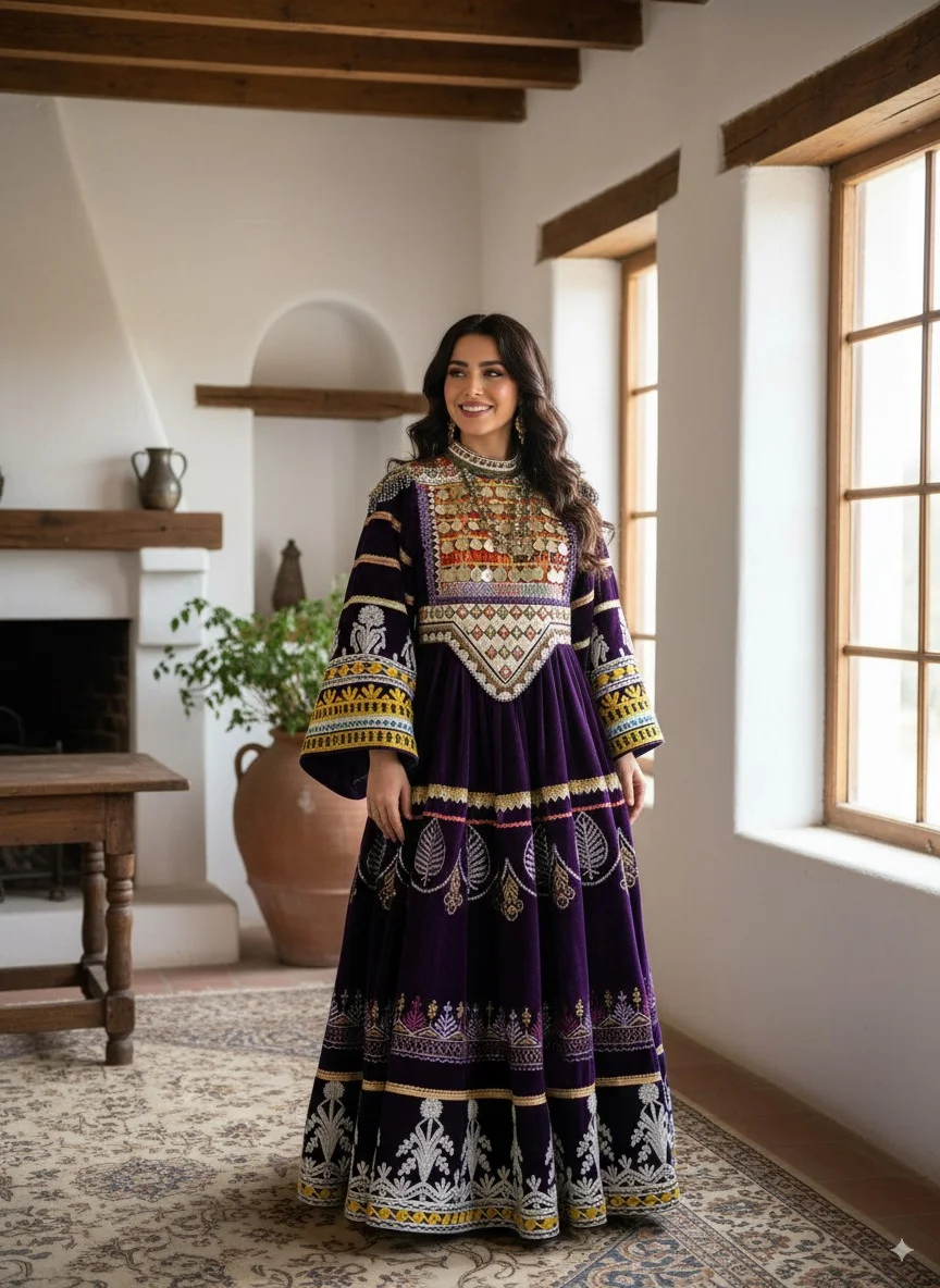 Introducing the “Velvet Rosewood Afghan Charm,” a three-piece ensemble of timeless allure. The magenta velvet gown, adorned with vintage almond-style embroidery, drapes gracefully, exuding regality. Paired with comfortable trousers and a dupatta featuring matching embroidery, this ensemble seamlessly fuses tradition with elegance. Step into cultural pride and enduring style with this captivating Afghan dress.